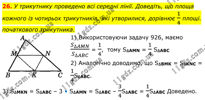 У трикутнику проведено всі середні лінії. Доведіть, що площа кожного із чотирьох трикутників, які утворилися, дорівнює 1/4 площі. початкового трикутника. 1) Використовуючи задачу 926, маємо S_∆AMN/S_∆ABC = 1/4, тому S∆AMN = 1/4 S∆ABC 2) Аналогічно доводимо, що S∆BMK = S∆KNC = 1/4S∆ABC. 3) S∆MKN = S∆ABC – 3 • S∆AMN = S∆ABC – 3/4S∆ABC = 1/4S∆ABC Доведено.