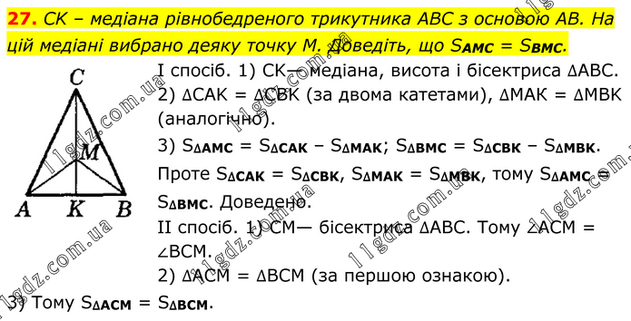 CK – медіана рівнобедреного трикутника ABC з основою AB. На цій медіані вибрано деяку точку M. Доведіть, що SAMC = SBMC. І спосіб. 1) CK— медіана, висота і бісектриса ∆ABC. 2) ∆CAK = ∆CBK (за двома катетами), ∆МАК = ∆MBK (аналогічно). 3) S∆AMC = S∆CAK – S∆MAK; S∆BMC = S∆СВК – S∆MBK. Проте S∆CAK = S∆CBK, S∆MAK = S∆MBK, тому S∆АМС = S∆ВМС. Доведено. ІІ спосіб. 1) CM— бісектриса ∆ABC. Тому ∠ACM = ∠BCM. 2) ∆ACM = ∆BCM (за першою ознакою). 3) Тому S∆АСМ = S∆BCM.