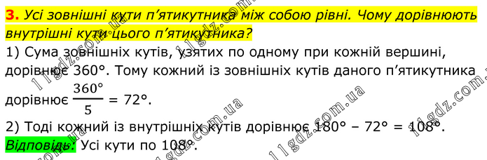 3. Усі зовнішні кути п’ятикутника між собою рівні. Чому дорівнюють внутрішні кути цього п’ятикутника? 1) Сума зовнішніх кутів, узятих по одному при кожній вершині, дорівнює 360°. Тому кожний із зовнішніх кутів даного п’ятикутника дорівнює (360°)/5 = 72°. 2) Тоді кожний із внутрішніх кутів дорівнює 180° – 72° = 108°. Відповідь: Усі кути по 108°.