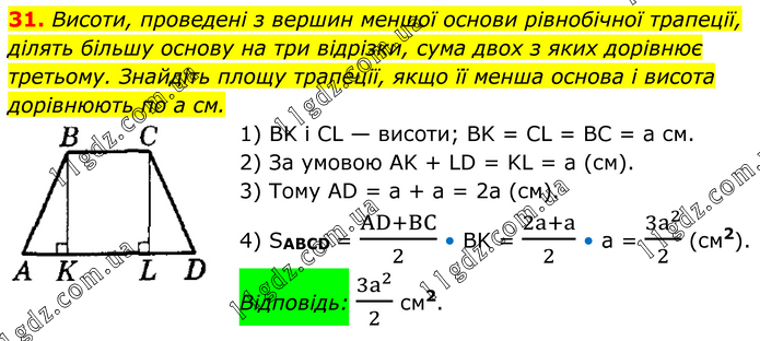 Висоти, проведені з вершин меншої основи рівнобічної трапеції, ділять більшу основу на три відрізки, сума двох з яких дорівнює третьому. Знайдіть площу трапеції, якщо її менша основа і висота дорівнюють по а см. 1) BK і CL — висоти; BK = CL = BC = а см. 2) За умовою AK + LD = KL = а (см). 3) Тому AD = а + а = 2а (см). 4) SABCD = (AD+BC)/2 • BK = (2a+a)/2 • a = (3a^2)/2 (см2). Відповідь: (3a^2)/2 см2.