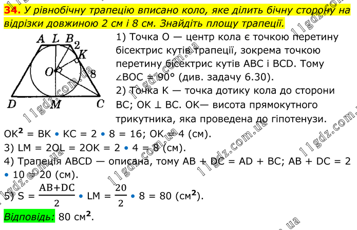 У рівнобічну трапецію вписано коло, яке ділить бічну сторону на відрізки довжиною 2 см і 8 см. Знайдіть площу трапеції. 1) Точка O — центр кола є точкою перетину бісектрис кутів трапеції, зокрема точкою перетину бісектрис кутів ABC і BCD. Тому ∠BOC = 90° (див. задачу 6.30). 2) Точка K — точка дотику кола до сторони BC; OK ⊥ BC. OK— висота прямокутного трикутника, яка проведена до гіпотенузи. OK2 = BK • KC = 2 • 8 = 16; OK = 4 (см). 3) LM = 2OL = 2OK = 2 • 4 = 8 (см). 4) Трапеція ABCD — описана, тому AB + DC = AD + BC; AB + DC = 2 • 10 = 20 (см). 5) S = (AB+DC)/2 • LM = 20/2 • 8 = 80 (см2). Відповідь: 80 см2.