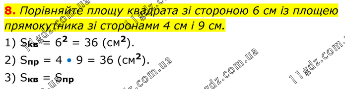 Порівняйте площу квадрата зі стороною 6 см із площею прямокутника зі сторонами 4 см і 9 см. 1) Skв = 62 = 36 (см2). 2) Sпp = 4 • 9 = 36 (см2). 3) Sкв = Sпр