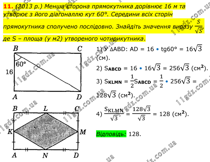 (2013 р.) Менша сторона прямокутника дорівнює 16 м та утворює з його діагоналлю кут 60°. Середини всіх сторін прямокутника сполучено послідовно. Знайдіть значення виразу S/√S, де S – площа (у м2) утвореного чотирикутника. 1) У ∆ABD: AD = 16 • tg60° = 16√3 (см). 2) SABCD = 16 • 16√3 = 256√3 (см2). 3) SKLMN = 1/2SABCD = 1/2 • 256√3 = 128√3 (см2). 4) S_KLMN/√3 = (128√3)/√3 = 128 (cм2). Відповідь: 128.