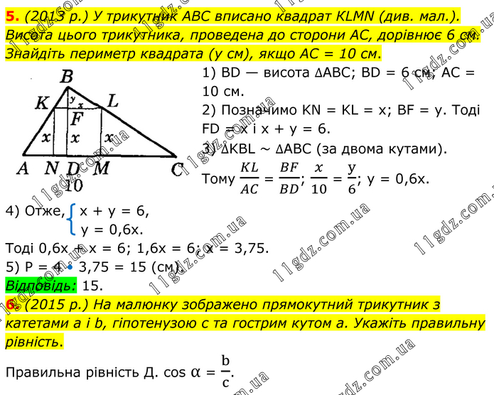 5. (2013 р.) У трикутник АВС вписано квадрат КLМN (див. мал.). Висота цього трикутника, проведена до сторони АС, дорівнює 6 см. Знайдіть периметр квадрата (у см), якщо АС = 10 см. 1) BD — висота ∆АВС; BD = 6 см; AC = 10 см. 2) Позначимо KN = KL = х; BF = у. Тоді FD = х і х + у = 6. 3) ∆KBL ~ ∆АВС (за двома кутами). Тому KL/AC = BF/BD; x/10 = y/6; y = 0,6x. 4) Отже, x + y = 6, y = 0,6x. Тоді 0,6х + х = 6; 1,6x = 6; х = 3,75. 5) P = 4 • 3,75 = 15 (см). Відповідь: 15. 6. (2015 р.) На малюнку зображено прямокутний трикутник з катетами а і b, гіпотенузою с та гострим кутом а. Укажіть правильну рівність. Правильна рівність Д. cos α = b/c.