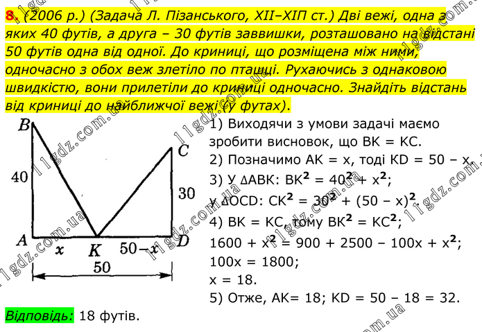 (2006 р.) (Задача Л. Пізанського, ХІІ–ХІП ст.) Дві вежі, одна з яких 40 футів, а друга – 30 футів заввишки, розташовано на відстані 50 футів одна від одної. До криниці, що розміщена між ними, одночасно з обох веж злетіло по пташці. Рухаючись з однаковою швидкістю, вони прилетіли до криниці одночасно. Знайдіть відстань від криниці до найближчої вежі (у футах). 1) Виходячи з умови задачі маємо зробити висновок, що BK = KC. 2) Позначимо AK = х, тоді КD = 50 – х. 3) У ∆АВК: BK2 = 402 + х2; у ∆OCD: CK2 = 302 + (50 – х)2. 4) BK = KC, тому ВК2 = KC2; 1600 + х2 = 900 + 2500 – 100x + х2; 100x = 1800; х = 18. 5) Отже, AK= 18; KD = 50 – 18 = 32. Відповідь: 18 футів.
