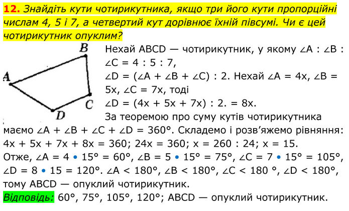 Знайдіть кути чотирикутника, якщо три його кути пропорційні числам 4, 5 і 7, а четвертий кут дорівнює їхній півсумі. Чи є цей чотирикутник опуклим? Нехай АВСD — чотирикутник, у якому ∠A : ∠B : ∠C = 4 : 5 : 7, ∠D = (∠А + ∠B + ∠С) : 2. Нехай ∠А = 4x, ∠B = 5x, ∠C = 7х, тоді ∠D = (4х + 5х + 7х) : 2. = 8x. За теоремою про суму кутів чотирикутника маємо ∠A + ∠B + ∠C + ∠D = 360°. Складемо і розв’яжемо рівняння: 4х + 5х + 7х + 8х = 360; 24х = 360; х = 260 : 24; х = 15. Отже, ∠A = 4 • 15° = 60°, ∠B = 5 • 15° = 75°, ∠C = 7 • 15° = 105°, ∠D = 8 • 15 = 120°. ∠A < 180°, ∠В < 180°, ∠C < 180 °, ∠D < 180°, тому АВСD — опуклий чотирикутник. Відповідь: 60°, 75°, 105°, 120°; АВСD — опуклий чотирикутник.