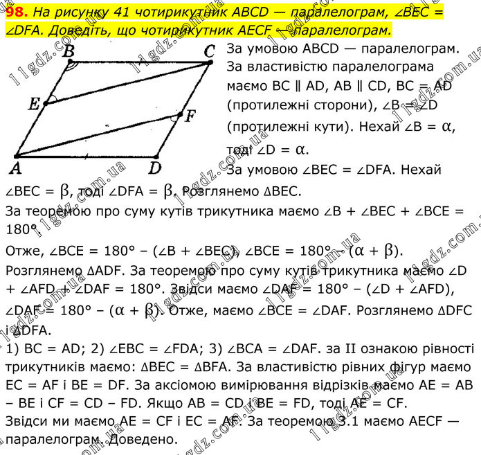 98. На рисунку 41 чотирикутник ABCD — паралелограм, ∠BEC = ∠DFA. Доведіть, що чотирикутник AECF — паралелограм. За умовою АВСD — паралелограм. За властивістю паралелограма маємо ВС ∥ АD, АВ ∥ СD, ВС = АD (протилежні сторони), ∠В = ∠D (протилежні кути). Нехай ∠В = α, тоді ∠D = α. За умовою ∠ВЕС = ∠DFА. Нехай ∠ВЕС = β, тоді ∠DFА = β. Розглянемо ∆ВЕС. За теоремою про суму кутів трикутника маємо ∠В + ∠ВЕС + ∠ВСЕ = 180°. Отже, ∠ВСЕ = 180° – (∠В + ∠ВЕС), ∠ВСЕ = 180° – (α + β). Розглянемо ∆АDF. За теоремою про суму кутів трикутника маємо ∠D + ∠АFD + ∠DАF = 180°. Звідси маємо ∠DАF = 180° – (∠D + ∠АFD), ∠DАF = 180° – (α + β). Отже, маємо ∠ВСЕ = ∠DАF. Розглянемо ∆DFС і ∆DFА. 1) ВС = АD; 2) ∠ЕВС = ∠FDА; 3) ∠ВСА = ∠DАF. за II ознакою рівності трикутників маємо: ∆ВЕС = ∆ВFА. За властивістю рівних фігур маємо ЕС = АF і ВЕ = DF. За аксіомою вимірювання відрізків маємо АЕ = АВ – ВЕ і СF = СD – FD. Якщо АВ = СD і ВЕ = FD, тоді АЕ = СF. Звідси ми маємо АЕ = СF і ЕС = АF. За теоремою 3.1 маємо АЕСF — паралелограм. Доведено.