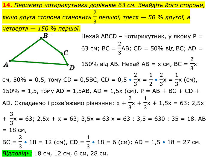 Периметр чотирикутника дорівнює 63 см. Знайдіть його сторони, якщо друга сторона становить 2/3 першої, третя — 50 % другої, а четверта — 150 % першої. Нехай ABCD – чотирикутник, у якому Р = 63 см; ВС = 2/3АВ; CD = 50% від ВС; AD = 150% від АВ. Нехай АВ = х см, ВС = 2/3х см, 50% = 0,5, тому CD = 0,5BC, CD = 0,5 • 2/3x = 1/2 • 2/3x = 1/3x (см), 150% = 1,5, тому AD = 1,5AB, AD = 1,5x (см). Р = АВ + ВС + CD + AD. Складаємо і розв’яжемо рівняння: х + 2/3х + 1/3х + 1,5х = 63; 2,5х + 3/3х = 63; 2,5х + х = 63; 3,5х = 63 х = 63 : 3,5 = 630 : 35 = 18. АВ = 18 см, ВС = 2/3 • 18 = 12 (см), CD = 1/3 • 18 = 6 (см); AD = 1,5 • 18 = 27 cм. Відповідь: 18 см, 12 см, 6 см, 28 см.