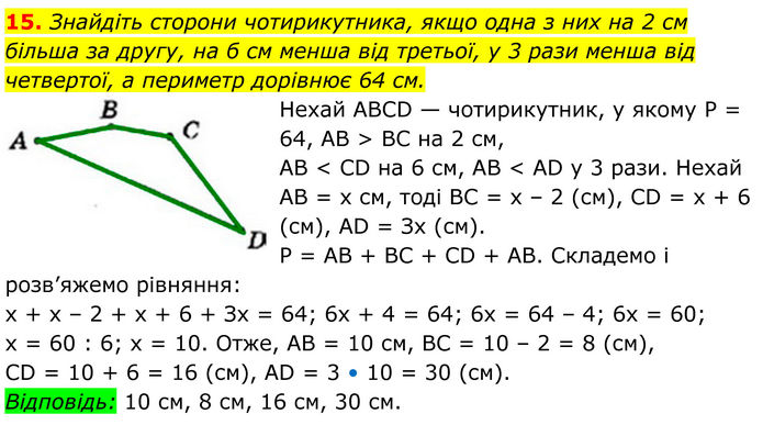 Знайдіть сторони чотирикутника, якщо одна з них на 2 см більша за другу, на б см менша від третьої, у 3 рази менша від четвертої, а периметр дорівнює 64 см. Нехай АВСD — чотирикутник, у якому Р = 64, АВ > ВС на 2 см, АВ < СD на 6 см, АВ < АD у 3 рази. Нехай АВ = х см, тоді ВС = х – 2 (см), СD = х + 6 (см), АD = Зx (см). Р = АВ + ВС + СD + АВ. Складемо і розв’яжемо рівняння: х + х – 2 + х + 6 + Зх = 64; 6х + 4 = 64; 6x = 64 – 4; 6x = 60; х = 60 : 6; х = 10. Отже, АВ = 10 см, ВС = 10 – 2 = 8 (см), СD = 10 + 6 = 16 (см), АD = 3 • 10 = 30 (см). Відповідь: 10 см, 8 см, 16 см, 30 см.