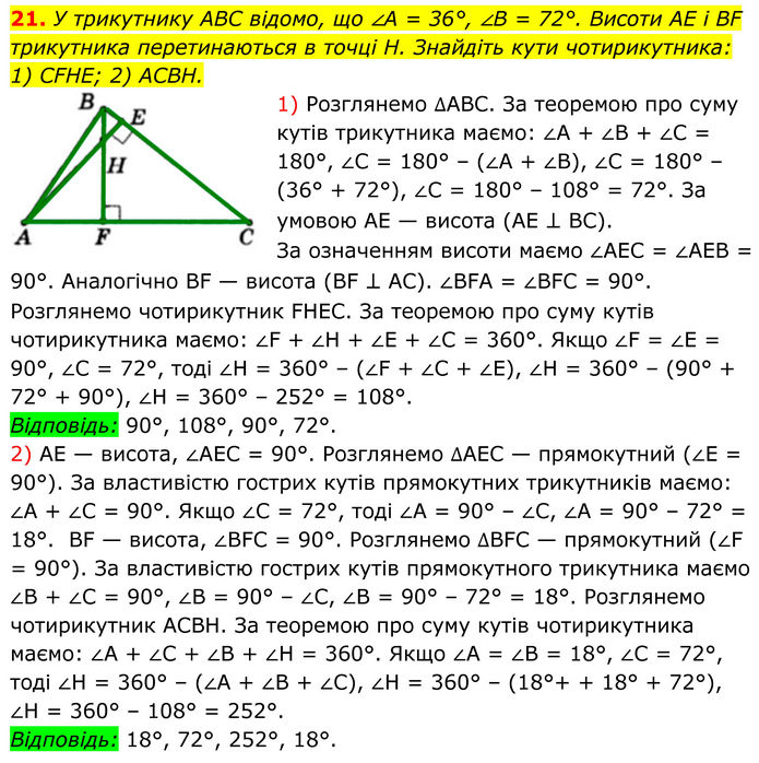 У трикутнику ABC відомо, що ∠A = 36°, ∠B = 72°. Висоти AE і BF трикутника перетинаються в точці H. Знайдіть кути чотирикутника: 1) CFHE; 2) ACBH. 1) Розглянемо ∆АВС. За теоремою про суму кутів трикутника маємо: ∠A + ∠B + ∠C = 180°, ∠C = 180° – (∠А + ∠B), ∠C = 180° – (36° + 72°), ∠C = 180° – 108° = 72°. За умовою АЕ — висота (АЕ ⊥ ВС). За означенням висоти маємо ∠AEC = ∠АЕВ = 90°. Аналогічно ВF — висота (ВF ⊥ АС). ∠BFA = ∠ВFС = 90°. Розглянемо чотирикутник FНЕС. За теоремою про суму кутів чотирикутника маємо: ∠F + ∠H + ∠E + ∠C = 360°. Якщо ∠F = ∠E = 90°, ∠C = 72°, тоді ∠H = 360° – (∠F + ∠C + ∠E), ∠H = 360° – (90° + 72° + 90°), ∠H = 360° – 252° = 108°. Відповідь: 90°, 108°, 90°, 72°. 2) АЕ — висота, ∠АЕС = 90°. Розглянемо ∆АЕС — прямокутний (∠E = 90°). За властивістю гострих кутів прямокутних трикутників маємо: ∠A + ∠C = 90°. Якщо ∠C = 72°, тоді ∠A = 90° – ∠C, ∠A = 90° – 72° = 18°. ВF — висота, ∠ВFС = 90°. Розглянемо ∆ВFС — прямокутний (∠F = 90°). За властивістю гострих кутів прямокутного трикутника маємо ∠В + ∠C = 90°, ∠B = 90° – ∠C, ∠В = 90° – 72° = 18°. Розглянемо чотирикутник АСВН. За теоремою про суму кутів чотирикутника маємо: ∠A + ∠C + ∠B + ∠H = 360°. Якщо ∠A = ∠B = 18°, ∠C = 72°, тоді ∠H = 360° – (∠A + ∠B + ∠C), ∠H = 360° – (18°+ + 18° + 72°), ∠H = 360° – 108° = 252°. Відповідь: 18°, 72°, 252°, 18°.