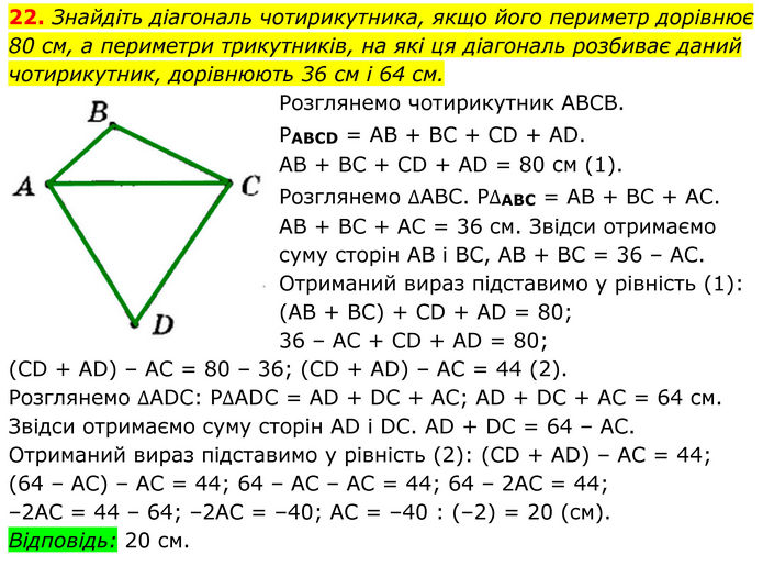 Знайдіть діагональ чотирикутника, якщо його периметр дорівнює 80 см, а периметри трикутників, на які ця діагональ розбиває даний чотирикутник, дорівнюють 36 см і 64 см. Розглянемо чотирикутник АВСВ. РABCD = АВ + ВС + СD + АD. АВ + ВС + СD + АD = 80 см (1). Розглянемо ∆АВС. Р∆ABC = АВ + ВС + АС. АВ + ВС + АС = 36 см. Звідси отримаємо суму сторін АВ і ВС, АВ + ВС = 36 – АС. Отриманий вираз підставимо у рівність (1): (АВ + ВС) + СD + АD = 80; 36 – АС + СD + АD = 80; (СD + АD) – АС = 80 – 36; (СD + АD) – АС = 44 (2). Розглянемо ∆АDС: Р∆ADC = AD + DС + АС; АD + DС + АС = 64 см. Звідси отримаємо суму сторін АD і DС. АD + DС = 64 – АС. Отриманий вираз підставимо у рівність (2): (СD + АD) – АС = 44; (64 – АС) – АС = 44; 64 – АС – АС = 44; 64 – 2АС = 44; –2АС = 44 – 64; –2АС = –40; АС = –40 : (–2) = 20 (см). Відповідь: 20 см.