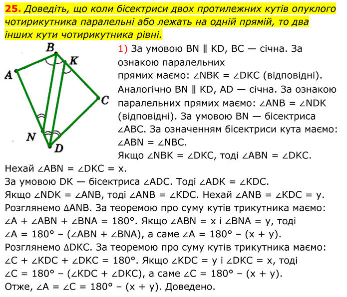 Доведіть, що коли бісектриси двох протилежних кутів опуклого чотирикутника паралельні або лежать на одній прямій, то два інших кути чотирикутника рівні. 1) За умовою ВN ∥ KD, ВС — січна. За ознакою паралельних прямих маємо: ∠NВК = ∠DКС (відповідні). Аналогічно ВN ∥ КD, АD — січна. За ознакою паралельних прямих маємо: ∠ANB = ∠NDК (відповідні). За умовою ВN — бісектриса ∠ABC. За означенням бісектриси кута маємо: ∠АBN = ∠NВС. Якщо ∠NBK = ∠DКС, тоді ∠АBN = ∠DKС. Нехай ∠ABN = ∠DKC = х. За умовою DК — бісектриса ∠АDС. Тоді ∠ADК = ∠КDС. Якщо ∠NDK = ∠АNВ, тоді ∠ANВ = ∠КDС. Нехай ∠ANB = ∠КDС = y. Розглянемо ∆АNВ. За теоремою про суму кутів трикутника маємо: ∠А + ∠АBN + ∠BNA = 180°. Якщо ∠АBN = х і ∠BNA = y, тоді ∠A = 180° – (∠АBN + ∠ВNА), а саме ∠A = 180° – (х + у). Розглянемо ∆DКС. За теоремою про суму кутів трикутника маємо: ∠C + ∠КDС + ∠DKC = 180°. Якщо ∠KDC = у і ∠DКС = х, тоді ∠C = 180° – (∠КDС + ∠DКС), а саме ∠C = 180° – (х + у). Отже, ∠A = ∠C = 180° – (х + у). Доведено.