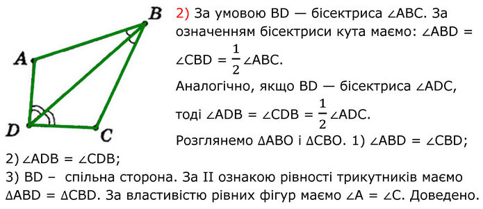 2) За умовою BD — бісектриса ∠ABC. За означенням бісектриси кута маємо: ∠АВD = ∠СВD = 1/2∠ABC. Аналогічно, якщо ВD — бісектриса ∠АDС, тоді ∠АDВ = ∠СDВ = 1/2∠АDС. Розглянемо ∆АВО і ∆СВО. 1) ∠ABD = ∠CBD; 2) ∠АDВ = ∠CDB; 3) ВD – спільна сторона. За II ознакою рівності трикутників маємо ∆АBD = ∆СВD. За властивістю рівних фігур маємо ∠A = ∠C. Доведено.