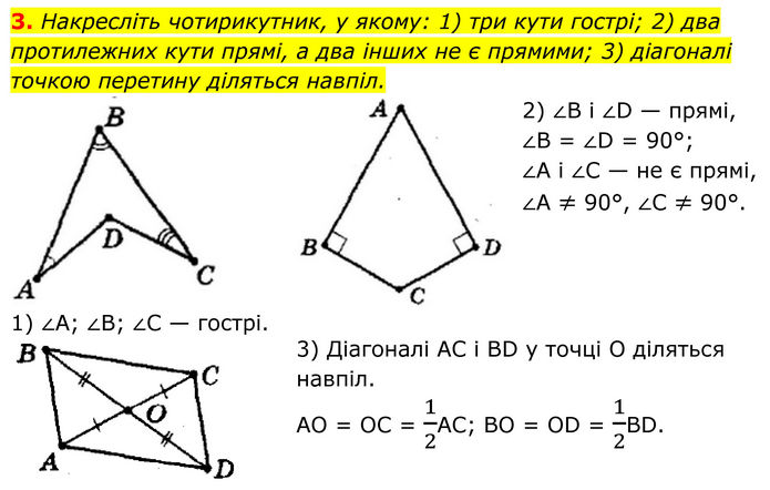 Накресліть чотирикутник, у якому: 1) три кути гострі; 2) два протилежних кути прямі, а два інших не є прямими; 3) діагоналі точкою перетину діляться навпіл. 1) ∠А; ∠В; ∠С — гострі. 2) ∠В і ∠D — прямі, ∠В = ∠D = 90°; ∠А і ∠С — не є прямі, ∠А ≠ 90°, ∠С ≠ 90°. 3) Діагоналі АС і ВD у точці О діляться навпіл. AO = OC = 1/2AC; BO = OD = 1/2BD.