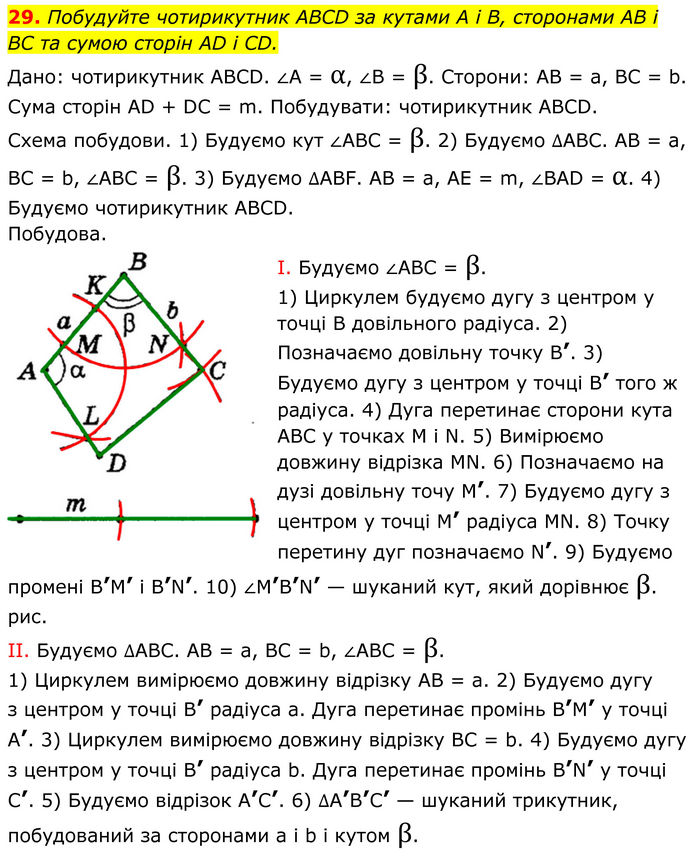 Побудуйте чотирикутник ABCD за кутами А і В, сторонами AB і BC та сумою сторін AD і CD. Дано: чотирикутник АВСD. ∠A = α, ∠B = β. Сторони: АВ = а, ВС = b. Сума сторін АD + DС = m. Побудувати: чотирикутник АВСD. Схема побудови. 1) Будуємо кут ∠АВС = β. 2) Будуємо ∆АВС. АВ = а, ВС = b, ∠АВС = β. 3) Будуємо ∆АВF. АВ = а, АЕ = m, ∠ВАD = α. 4) Будуємо чотирикутник АВСD. Побудова. І. Будуємо ∠АВС = β. 1) Циркулем будуємо дугу з центром у точці В довільного радіуса. 2) Позначаємо довільну точку В’. 3) Будуємо дугу з центром у точці В’ того ж радіуса. 4) Дуга перетинає сторони кута АВС у точках М і N. 5) Вимірюємо довжину відрізка МN. 6) Позначаємо на дузі довільну точу М’. 7) Будуємо дугу з центром у точці М’ радіуса MN. 8) Точку перетину дуг позначаємо N’. 9) Будуємо промені В’М’ і B’N’. 10) ∠М’В’N’ — шуканий кут, який дорівнює β. рис. II. Будуємо ∆АВС. АВ = а, ВС = b, ∠АВС = β. 1) Циркулем вимірюємо довжину відрізку АВ = а. 2) Будуємо дугу з центром у точці В’ радіуса а. Дуга перетинає промінь В’М’ у точці А’. 3) Циркулем вимірюємо довжину відрізку ВС = b. 4) Будуємо дугу з центром у точці В’ радіуса b. Дуга перетинає промінь В’N’ у точці С’. 5) Будуємо відрізок А’С’. 6) ∆А’В’С’ — шуканий трикутник, побудований за сторонами а і b і кутом β.