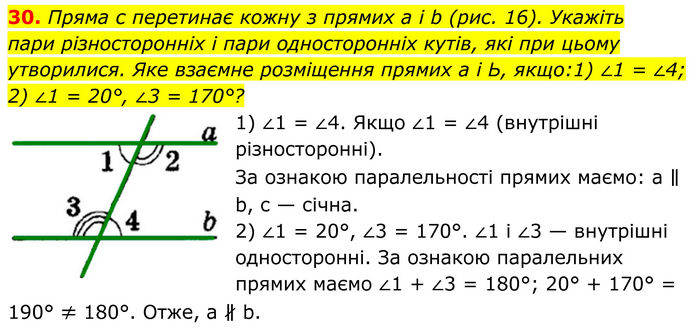 Пряма с перетинає кожну з прямих а і b (рис. 16). Укажіть пари різносторонніх і пари односторонніх кутів, які при цьому утворилися. Яке взаємне розміщення прямих а і Ь, якщо:1) ∠1 = ∠4; 2) ∠1 = 20°, ∠3 = 170°? 1) ∠1 = ∠4. Якщо ∠1 = ∠4 (внутрішні різносторонні). За ознакою паралельності прямих маємо: а ∥ b, с — січна. 2) ∠1 = 20°, ∠3 = 170°. ∠1 і ∠3 — внутрішні односторонні. За ознакою паралельних прямих маємо ∠1 + ∠3 = 180°; 20° + 170° = 190° ≠ 180°. Отже, а ∦ b.