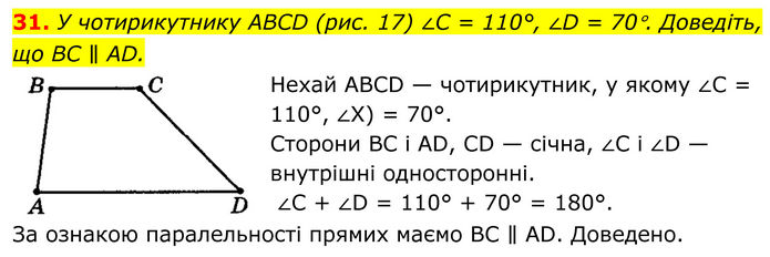 У чотирикутнику ABCD (рис. 17) ∠C = 110°, ∠D = 70°. Доведіть, що BC ∥ AD. Нехай АВСD — чотирикутник, у якому ∠C = 110°, ∠X) = 70°. Сторони ВС і АD, СD — січна, ∠C і ∠D — внутрішні односторонні. ∠C + ∠D = 110° + 70° = 180°. За ознакою паралельності прямих маємо ВС ∥ АD. Доведено.