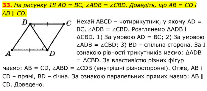 На рисунку 18 AD = BC, ∠ADB = ∠CBD. Доведіть, що AB = CD і AB ∥ CD. Нехай ABCD – чотирикутник, у якому AD = BC, ∠ADB = ∠CBD. Розглянемо ∆ADB і ∆CBD. 1) За умовою AD = BC; 2) За умовою ∠ADB = ∠CBD; 3) BD – спільна сторона. За І ознакою рівності трикутників маємо: ∆ADB = ∆CBD. За властивістю різних фігур маємо: AB = CD, ∠ABD = ∠CDB (внутрішні різносторонні). Отже, AB і CD – прямі, BD – січна. За ознакою паралельних прямих маємо: AB ∥ CD. Доведено.
