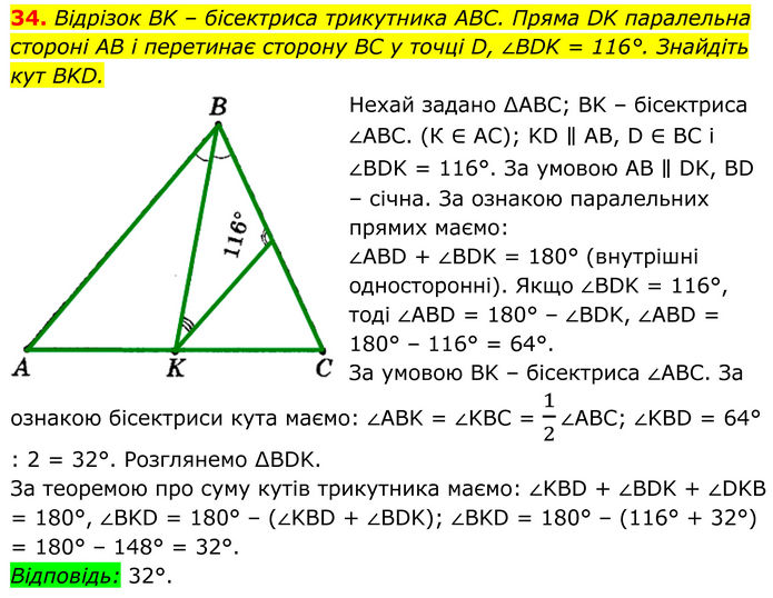 Відрізок BK – бісектриса трикутника ABC. Пряма DK паралельна стороні AB і перетинає сторону BC у точці D, ∠BDK = 116°. Знайдіть кут BKD. Нехай задано ∆ABC; BK – бісектриса ∠ABC. (К ∈ AC); KD ∥ АВ, D ∈ BC і ∠BDK = 116°. За умовою AB ∥ DK, BD – січна. За ознакою паралельних прямих маємо: ∠ABD + ∠BDK = 180° (внутрішні односторонні). Якщо ∠BDK = 116°, тоді ∠ABD = 180° – ∠BDK, ∠ABD = 180° – 116° = 64°. За умовою BK – бісектриса ∠ABC. За ознакою бісектриси кута маємо: ∠ABK = ∠KBC = 1/2∠ABC; ∠KBD = 64° : 2 = 32°. Розглянемо ∆BDK. За теоремою про суму кутів трикутника маємо: ∠KBD + ∠BDK + ∠DKB = 180°, ∠BKD = 180° – (∠KBD + ∠BDK); ∠BKD = 180° – (116° + 32°) = 180° – 148° = 32°. Відповідь: 32°.