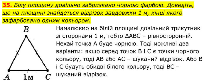 Білу площину довільно забризкано чорною фарбою. Доведіть, що на площині знайдеться відрізок завдовжки 1 м, кінці якого зафарбовано одним кольором. Намалюємо на білій площині довільний трикутник зі сторонами 1 м, тобто ∆ABC – рівносторонній. Нехай точка А буде чорною. Тоді можливі два варіанти: якщо серед точок В і С є точки чорного кольору, тоді AB або AC – шуканий відрізок. Або В і С будуть обидві білого кольору, тоді BC – шуканий відрізок.