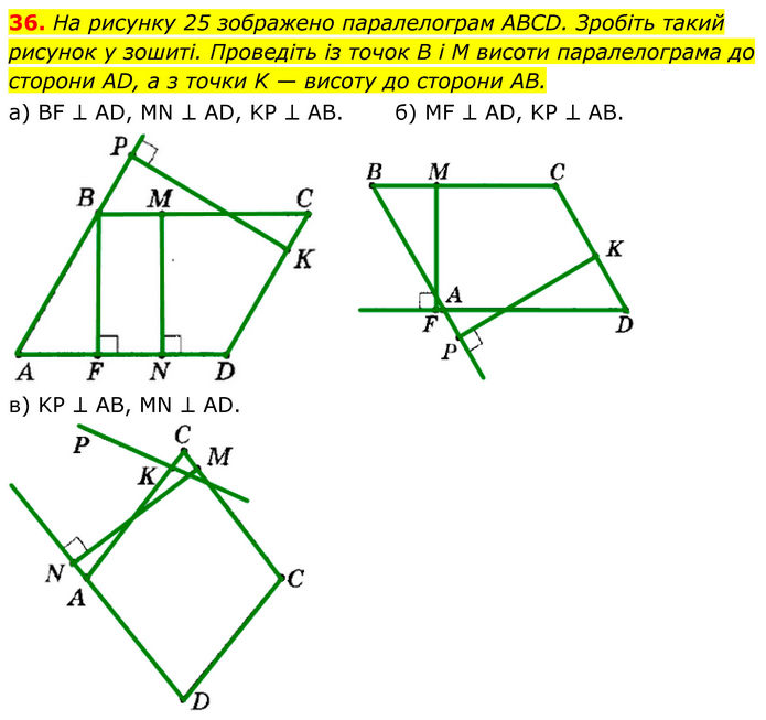 На рисунку 25 зображено паралелограм ABCD. Зробіть такий рисунок у зошиті. Проведіть із точок В і M висоти паралелограма до сторони AD, а з точки K — висоту до сторони AB. а) BF ⊥ AD, MN ⊥ AD, KP ⊥ AB. б) MF ⊥ AD, KP ⊥ AB. в) KP ⊥ AB, MN ⊥ AD.
