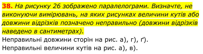 На рисунку 26 зображено паралелограми. Визначте, не виконуючи вимірювань, на яких рисунках величини кутів або довжини відрізків позначено неправильно (довжини відрізків наведено в сантиметрах). Неправильні довжини сторін на рис. а), г), ґ). Неправильні величини кутів на рис. а), в).