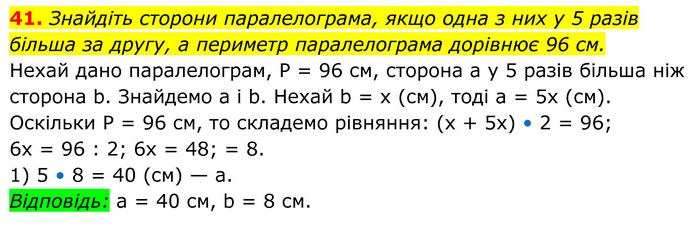 Знайдіть сторони паралелограма, якщо одна з них у 5 разів більша за другу, а периметр паралелограма дорівнює 96 см. Нехай дано паралелограм, Р = 96 см, сторона а у 5 разів більша ніж сторона b. Знайдемо а і b. Нехай b = x (см), тоді а = 5х (см). Оскільки P = 96 см, то складемо рівняння: (х + 5х) • 2 = 96; 6х = 96 : 2; 6х = 48; = 8. 1) 5 • 8 = 40 (см) — а. Відповідь: а = 40 см, b = 8 см.