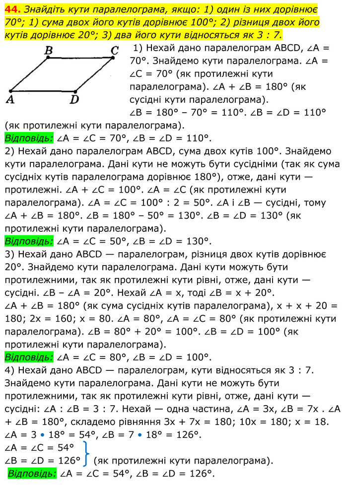 Знайдіть кути паралелограма, якщо: 1) один із них дорівнює 70°; 1) сума двох його кутів дорівнює 100°; 2) різниця двох його кутів дорівнює 20°; 3) два його кути відносяться як 3 : 7. 1) Нехай дано паралелограм АВСD, ∠А = 70°. Знайдемо кути паралелограма. ∠А = ∠С = 70° (як протилежні кути паралелограма). ∠А + ∠В = 180° (як сусідні кути паралелограма). ∠В = 180° – 70° = 110°. ∠В = ∠D = 110° (як протилежні кути паралелограма). Відповідь: ∠А = ∠С = 70°, ∠В = ∠D = 110°. 2) Нехай дано паралелограм АВСD, сума двох кутів 100°. Знайдемо кути паралелограма. Дані кути не можуть бути сусідніми (так як сума сусідніх кутів паралелограма дорівнює 180°), отже, дані кути — протилежні. ∠А + ∠С = 100°. ∠А = ∠С (як протилежні кути паралелограма). ∠А = ∠С = 100° : 2 = 50°. ∠А і ∠В — сусідні, тому ∠А + ∠В = 180°. ∠В = 180° – 50° = 130°. ∠В = ∠D = 130° (як протилежні кути паралелограма). Відповідь: ∠А = ∠С = 50°, ∠В = ∠D = 130°. 3) Нехай дано АВСD — паралелограм, різниця двох кутів дорівнює 20°. Знайдемо кути паралелограма. Дані кути можуть бути протилежними, так як протилежні кути рівні, отже, дані кути — сусідні. ∠B – ∠А = 20°. Нехай ∠A = х, тоді ∠В = x + 20°. ∠A + ∠В = 180° (як сума сусідніх кутів паралелограма), х + х + 20 = 180; 2х = 160; x = 80. ∠A = 80°, ∠А = ∠С = 80° (як протилежні кути паралелограма). ∠B = 80° + 20° = 100°. ∠B = ∠D = 100° (як протилежні кути паралелограма). Відповідь: ∠A = ∠C = 80°, ∠B = ∠D = 100°. 4) Нехай дано АВСD — паралелограм, кути відносяться як 3 : 7. Знайдемо кути паралелограма. Дані кути не можуть бути протилежними, так як протилежні кути рівні, отже, дані кути — сусідні: ∠A : ∠B = 3 : 7. Нехай — одна частина, ∠A = Зх, ∠B = 7x . ∠A + ∠B = 180°, складемо рівняння Зх + 7х = 180; 10х = 180; x = 18. ∠A = 3 • 18° = 54°, ∠B = 7 • 18° = 126°. ∠A = ∠C = 54° ∠B = ∠D = 126° (як протилежні кути паралелограма). Відповідь: ∠А = ∠С = 54°, ∠В = ∠D = 126°.