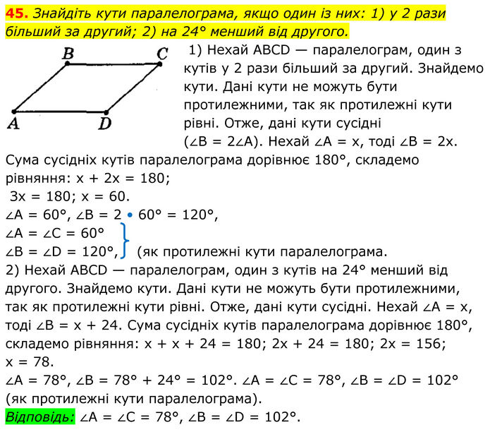 Знайдіть кути паралелограма, якщо один із них: 1) у 2 рази більший за другий; 2) на 24° менший від другого. 1) Нехай АВСD — паралелограм, один з кутів у 2 рази більший за другий. Знайдемо кути. Дані кути не можуть бути протилежними, так як протилежні кути рівні. Отже, дані кути сусідні (∠В = 2∠A). Нехай ∠A = х, тоді ∠B = 2х. Сума сусідніх кутів паралелограма дорівнює 180°, складемо рівняння: x + 2х = 180; Зх = 180; x = 60. ∠A = 60°, ∠B = 2 • 60° = 120°, ∠А = ∠С = 60° ∠B = ∠D = 120°, (як протилежні кути паралелограма. 2) Нехай АВСD — паралелограм, один з кутів на 24° менший від другого. Знайдемо кути. Дані кути не можуть бути протилежними, так як протилежні кути рівні. Отже, дані кути сусідні. Нехай ∠A = х, тоді ∠B = х + 24. Сума сусідніх кутів паралелограма дорівнює 180°, складемо рівняння: х + х + 24 = 180; 2х + 24 = 180; 2х = 156; x = 78. ∠A = 78°, ∠B = 78° + 24° = 102°. ∠A = ∠C = 78°, ∠B = ∠D = 102° (як протилежні кути паралелограма). Відповідь: ∠А = ∠С = 78°, ∠B = ∠D = 102°.