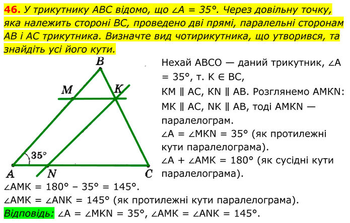 У трикутнику ABC відомо, що ∠A = 35°. Через довільну точку, яка належить стороні BC, проведено дві прямі, паралельні сторонам AB і AC трикутника. Визначте вид чотирикутника, що утворився, та знайдіть усі його кути. Нехай АВСО — даний трикутник, ∠A = 35°, т. K ∈ ВС, КМ ∥ АС, КN ∥ АВ. Розглянемо АМКN: МК ∥ АС, NK ∥ АВ, тоді АМКN — паралелограм. ∠А = ∠МКN = 35° (як протилежні кути паралелограма). ∠A + ∠АМК = 180° (як сусідні кути паралелограма). ∠АМК = 180° – 35° = 145°. ∠АМК = ∠АNК = 145° (як протилежні кути паралелограма). Відповідь: ∠А = ∠MKN = 35°, ∠АМК = ∠АNК = 145°.