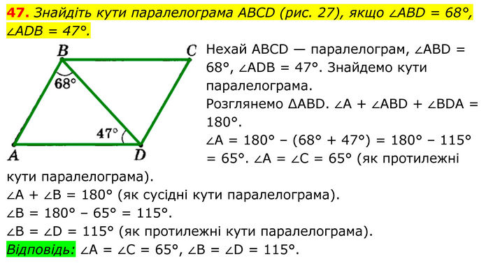 Знайдіть кути паралелограма ABCD (рис. 27), якщо ∠ABD = 68°, ∠ADB = 47°. Нехай АВСD — паралелограм, ∠ABD = 68°, ∠ADB = 47°. Знайдемо кути паралелограма. Розглянемо ∆АВD. ∠A + ∠ABD + ∠ВDА = 180°. ∠A = 180° – (68° + 47°) = 180° – 115° = 65°. ∠A = ∠C = 65° (як протилежні кути паралелограма). ∠A + ∠B = 180° (як сусідні кути паралелограма). ∠B = 180° – 65° = 115°. ∠B = ∠D = 115° (як протилежні кути паралелограма). Відповідь: ∠A = ∠C = 65°, ∠B = ∠D = 115°.