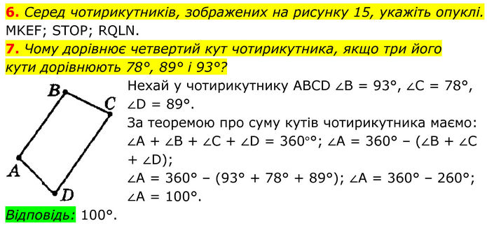 6. Серед чотирикутників, зображених на рисунку 15, укажіть опуклі. MKEF; STOP; RQLN. 7. Чому дорівнює четвертий кут чотирикутника, якщо три його кути дорівнюють 78°, 89° і 93°? Нехай у чотирикутнику ABCD ∠B = 93°, ∠C = 78°, ∠D = 89°. За теоремою про суму кутів чотирикутника маємо: ∠A + ∠B + ∠C + ∠D = 360°°; ∠A = 360° – (∠B + ∠C + ∠D); ∠A = 360° – (93° + 78° + 89°); ∠A = 360° – 260°; ∠A = 100°. Відповідь: 100°.