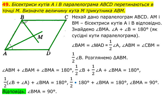 Бісектриси кутів A i B паралелограма ABCD перетинаються в точці M. Визначте величину кута M трикутника ABM. Нехай дано паралелограм АВСD. АМ і ВМ – бісектриси кутів А і В відповідно. Знайдемо ∠ВМА. ∠А + ∠В = 180° (як сусідні кути паралелограма). ∠ВАМ = ∠MAD = 1/2∠A, ∠АВМ = ∠СВМ = 1/2∠В. Розглянемо ∆АВМ. ∠АВМ + ∠ВАМ + ∠ВМА = 180°, 1/2∠В + 1/2∠А + ∠ВМА = 180°, 1/2(∠B + ∠A) + ∠BMA = 180°, 1/2 • 180° + ∠BMA = 180°, ∠BMA = 90°. Відповідь: ∠ВМА = 90°.