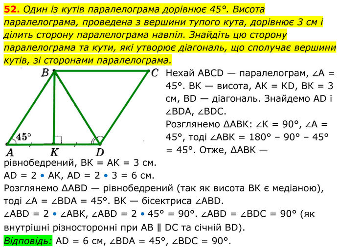 Один із кутів паралелограма дорівнює 45°. Висота паралелограма, проведена з вершини тупого кута, дорівнює 3 см і ділить сторону паралелограма навпіл. Знайдіть цю сторону паралелограма та кути, які утворює діагональ, що сполучає вершини кутів, зі сторонами паралелограма. Нехай АВСD — паралелограм, ∠А = 45°. ВК — висота, АК = КD, ВК = 3 см, ВD — діагональ. Знайдемо АD і ∠ВDА, ∠ВDС. Розглянемо ∆АВК: ∠К = 90°, ∠А = 45°, тоді ∠АВК = 180° – 90° – 45° = 45°. Отже, ∆АВК — рівнобедрений, ВК = АК = 3 см. АD = 2 • АК, АD = 2 • 3 = 6 см. Розглянемо ∆АВD — рівнобедрений (так як висота ВК є медіаною), тоді ∠А = ∠ВDА = 45°. ВК — бісектриса ∠АВD. ∠АВD = 2 • ∠АВК, ∠АВD = 2 • 45° = 90°. ∠АВD = ∠ВDС = 90° (як внутрішні різносторонні при АВ ∥ DС та січній ВD). Відповідь: АD = 6 см, ∠ВDА = 45°, ∠ВDС = 90°.