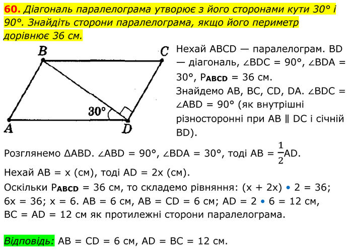Діагональ паралелограма утворює з його сторонами кути 30° і 90°. Знайдіть сторони паралелограма, якщо його периметр дорівнює 36 см. Нехай АВСD — паралелограм. ВD — діагональ, ∠ВDС = 90°, ∠ВDА = 30°, РABCD = 36 см. Знайдемо АВ, ВС, СD, DА. ∠ВDС = ∠АВD = 90° (як внутрішні різносторонні при АВ ∥ DС і січній ВD). Розглянемо ∆АВD. ∠АВD = 90°, ∠ВDА = 30°, тоді АВ = 1/2АD. Нехай АВ = x (см), тоді АD = 2х (см). Оскільки РАВСD = 36 см, то складемо рівняння: (х + 2х) • 2 = 36; 6x = 36; x = 6. АВ = 6 см, АВ = СD = 6 см; АD = 2 • 6 = 12 см, ВС = АD = 12 см як протилежні сторони паралелограма. Відповідь: АВ = СD = 6 см, АD = ВС = 12 см.