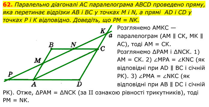 Паралельно діагоналі AC паралелограма ABCD проведено пряму, яка перетинає відрізки AB і BC у точках M і N, а прямі AD і CD у точках Р i К відповідно. Доведіть, що PM = NK. Розглянемо АМКС — паралелограм (АМ ∥ СК, МК ∥ АС), тоді АМ = СК. Розглянемо ∆РАМ і ∆NСК. 1) АМ = СК. 2) ∠МРА = ∠КNС (як відповідні при АD ∥ ВС і січній РК). 3) ∠РМА = ∠NКС (як відповідні при АВ ∥ DС і січній РК). Отже, ∆РАМ = ∆NСК (за II ознакою рівності трикутників), тоді РМ = NК.
