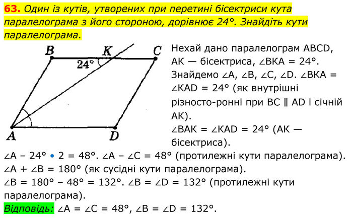 Один із кутів, утворених при перетині бісектриси кута паралелограма з його стороною, дорівнює 24°. Знайдіть кути паралелограма. Нехай дано паралелограм АВСD, АК — бісектриса, ∠ВКА = 24°. Знайдемо ∠А, ∠В, ∠С, ∠D. ∠ВКА = ∠КАD = 24° (як внутрішні різносторонні при ВС ∥ АD і січній АК). ∠ВАК = ∠КАD = 24° (АК — бісектриса). ∠А – 24° • 2 = 48°. ∠А – ∠С = 48° (протилежні кути паралелограма). ∠А + ∠В = 180° (як сусідні кути паралелограма). ∠В = 180° – 48° = 132°. ∠B = ∠D = 132° (протилежні кути паралелограма). Відповідь: ∠А = ∠С = 48°, ∠В = ∠D = 132°.