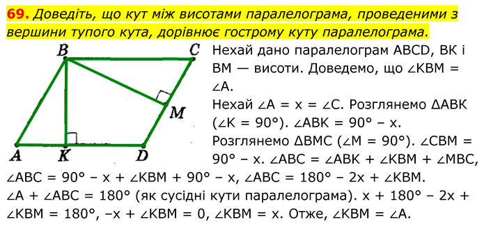 Доведіть, що кут між висотами паралелограма, проведеними з вершини тупого кута, дорівнює гострому куту паралелограма. Нехай дано паралелограм ABCD, ВК і ВМ — висоти. Доведемо, що ∠KBM = ∠A. Нехай ∠A = х = ∠C. Розглянемо ∆АВК (∠K = 90°). ∠ABK = 90° – х. Розглянемо ∆BMC (∠M = 90°). ∠CBM = 90° – х. ∠ABC = ∠ABK + ∠KBM + ∠MBC, ∠ABC = 90° – x + ∠KBM + 90° – x, ∠ABC = 180° – 2x + ∠KBM. ∠A + ∠ABC = 180° (як сусідні кути паралелограма). х + 180° – 2х + ∠KBM = 180°, –х + ∠KBM = 0, ∠KBM = x. Отже, ∠KBM = ∠А.