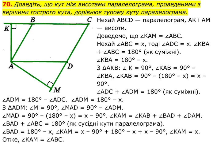 Доведіть, що кут між висотами паралелограма, проведеними з вершини гострого кута, дорівнює тупому куту паралелограма. Нехай ABCD — паралелограм, AK і AM — висоти. Доведемо, що ∠KAM = ∠ABC. Нехай ∠ABC = х, тоді ∠ADC = х. ∠KBA + ∠ABC = 180° (як суміжні). ∠KBA = 180° – х. З ∆АКВ: ∠ K = 90°, ∠KAB = 90° – ∠KBA, ∠KAB = 90° – (180° – х) = х – 90°. ∠ADC + ∠ADM = 180° (як суміжні). ∠ADM = 180° – ∠ADC. ∠ADM = 180° – х. З ∆ADM: ∠M = 90°, ∠MAD = 90° – ∠ADM. ∠MAD = 90° – (180° – х) = х – 90°. ∠KAM = ∠KAB + ∠BAD + ∠DAM. ∠BAD + ∠ABC = 180° (як сусідні кути паралелограма). ∠BAD = 180° – х, ∠KAM = х – 90° + 180° – х + х – 90°, ∠KAM = х. Отже, ∠KAM = ∠ABC.
