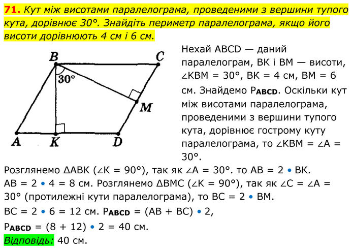 Кут між висотами паралелограма, проведеними з вершини тупого кута, дорівнює 30°. Знайдіть периметр паралелограма, якщо його висоти дорівнюють 4 см і 6 см. Нехай ABCD — даний паралелограм, ВК і ВМ — висоти, ∠KBM = 30°, ВК = 4 см, ВМ = 6 см. Знайдемо РАВСD. Оскільки кут між висотами паралелограма, проведеними з вершини тупого кута, дорівнює гострому куту паралелограма, то ∠KBM = ∠A = 30°. Розглянемо ∆АВК (∠К = 90°), так як ∠A = 30°. то АВ = 2 • ВК. АВ = 2 • 4 = 8 см. Розглянемо ∆ВМС (∠K = 90°), так як ∠C = ∠А = 30° (протилежні кути паралелограма), то ВС = 2 • ВМ. ВС = 2 • 6 = 12 см. РАВСD = (АВ + ВС) • 2, РАВСD = (8 + 12) • 2 = 40 см. Відповідь: 40 см.