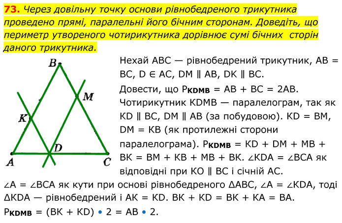 Через довільну точку основи рівнобедреного трикутника проведено прямі, паралельні його бічним сторонам. Доведіть, що периметр утвореного чотирикутника дорівнює сумі бічних сторін даного трикутника. Нехай АВС — рівнобедрений трикутник, АВ = ВС, D ∈ АС, DМ ∥ АВ, DK ∥ ВС. Довести, що РKDMB = АВ + ВС = 2АВ. Чотирикутник КDМВ — паралелограм, так як КD ∥ ВС, DМ ∥ АВ (за побудовою). КD = ВM, DМ = КВ (як протилежні сторони паралелограма). РKDMB = КD + DМ + МВ + ВК = ВМ + КВ + МВ + ВК. ∠КDА = ∠ВСА як відповідні при КО ∥ ВС і січній АС. ∠А = ∠ВСА як кути при основі рівнобедреного ∆АВС, ∠А = ∠КDА, тоді ∆КDА — рівнобедрений і АК = КD. ВК + КD = ВК + КА = ВА. РKDMB = (ВК + КD) • 2 = АВ • 2.