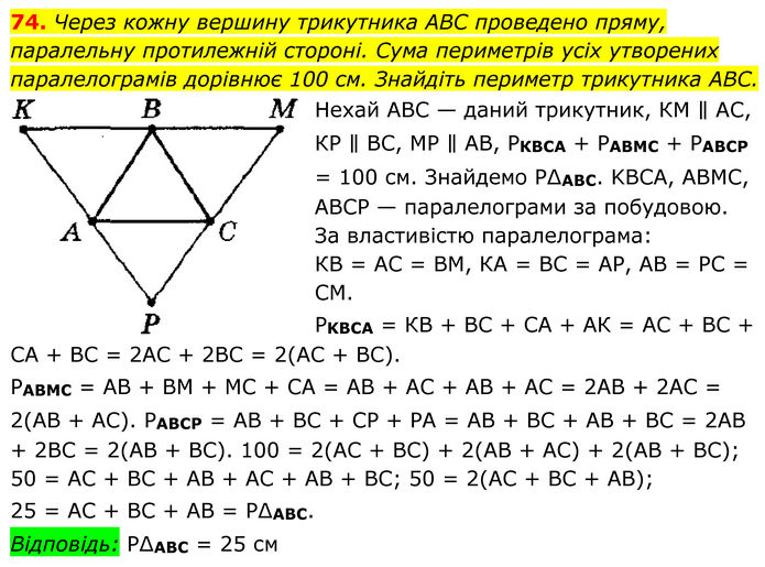 Через кожну вершину трикутника ABC проведено пряму, паралельну протилежній стороні. Сума периметрів усіх утворених паралелограмів дорівнює 100 см. Знайдіть периметр трикутника ABC. Нехай АВС — даний трикутник, КМ ∥ АС, КР ∥ ВС, МР ∥ АВ, РКВСА + РABMC + РАВСР = 100 см. Знайдемо P∆AВС. KBCA, АВМС, АВСР — паралелограми за побудовою. За властивістю паралелограма: КВ = АС = ВМ, КА = ВС = АР, АВ = РС = СМ. PKBCA = КВ + ВС + СА + АК = АС + ВС + СА + ВС = 2АС + 2ВС = 2(АС + ВС). PABMC = АВ + ВМ + МС + СА = АВ + АС + АВ + АС = 2АВ + 2АС = 2(АВ + АС). РABCP = АВ + ВС + СР + РА = АВ + ВС + АВ + ВС = 2АВ + 2ВС = 2(АВ + ВС). 100 = 2(АС + ВС) + 2(АВ + АС) + 2(АВ + ВС); 50 = АС + ВС + АВ + АС + АВ + ВС; 50 = 2(АС + ВС + АВ); 25 = АС + ВС + АВ = Р∆ABC. Відповідь: Р∆ABC = 25 см