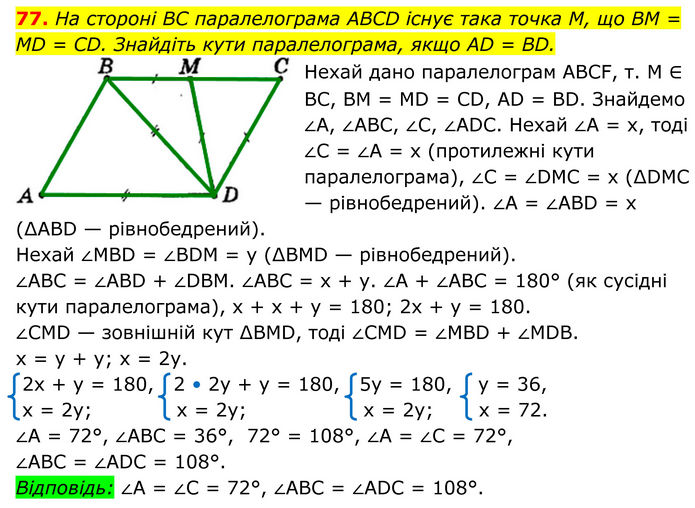 На стороні BC паралелограма ABCD існує така точка M, що BM = MD = CD. Знайдіть кути паралелограма, якщо AD = BD. Нехай дано паралелограм АВСF, т. M ∈ ВС, ВМ = MD = СD, АD = ВD. Знайдемо ∠А, ∠ABC, ∠С, ∠АDС. Нехай ∠А = х, тоді ∠С = ∠А = х (протилежні кути паралелограма), ∠С = ∠DМС = х (∆DМС — рівнобедрений). ∠А = ∠АBD = х (∆АBD — рівнобедрений). Нехай ∠МВD = ∠ВDМ = у (∆ВМD — рівнобедрений). ∠АВС = ∠АBD + ∠DВМ. ∠АВС = х + у. ∠А + ∠АВС = 180° (як сусідні кути паралелограма), х + х + у = 180; 2х + у = 180. ∠СМD — зовнішній кут ∆ВМD, тоді ∠СМD = ∠МВD + ∠MDB. х = у + у; х = 2у. 2x + y = 180, 2 • 2y + y = 180, 5y = 180, y = 36, х = 2y; x = 2y; x = 2y; х = 72. ∠А = 72°, ∠АВС = 36°, 72° = 108°, ∠А = ∠С = 72°, ∠АВС = ∠ADC = 108°. Відповідь: ∠А = ∠С = 72°, ∠АВС = ∠ADC = 108°.