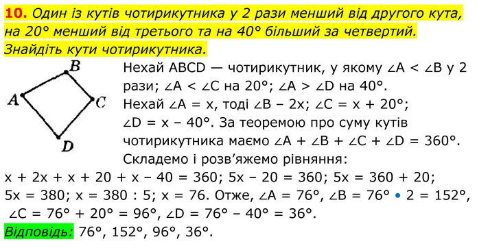 Один із кутів чотирикутника у 2 рази менший від другого кута, на 20° менший від третього та на 40° більший за четвертий. Знайдіть кути чотирикутника. Нехай АВСD — чотирикутник, у якому ∠А < ∠В у 2 рази; ∠А < ∠С на 20°; ∠А > ∠D на 40°. Нехай ∠А = х, тоді ∠В – 2х; ∠С = х + 20°; ∠D = х – 40°. За теоремою про суму кутів чотирикутника маємо ∠А + ∠B + ∠С + ∠D = 360°. Складемо і розв’яжемо рівняння: х + 2х + x + 20 + x – 40 = 360; 5х – 20 = 360; 5х = 360 + 20; 5х = 380; х = 380 : 5; x = 76. Отже, ∠A = 76°, ∠B = 76° • 2 = 152°, ∠C = 76° + 20° = 96°, ∠D = 76° – 40° = 36°. Відповідь: 76°, 152°, 96°, 36°.