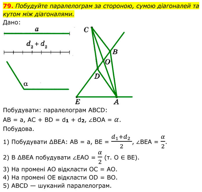 Побудуйте паралелограм за стороною, сумою діагоналей та кутом між діагоналями. Дано: Побудувати: паралелограм АВСD: АВ = а, АС + ВD = d1 + d2, ∠ВОА = α. Побудова. 1) Побудувати ∆ВЕА: АВ = a, ВЕ = (d_1+d_2 )/2, ∠ВЕА = α/2. 2) В ∆ВЕА побудувати ∠EAO = α/2 (т. O ∈ BE). 3) На промені АО відкласти ОС = АО. 4) На промені ОЕ відкласти ОD = ВО. 5) АВСD — шуканий паралелограм.