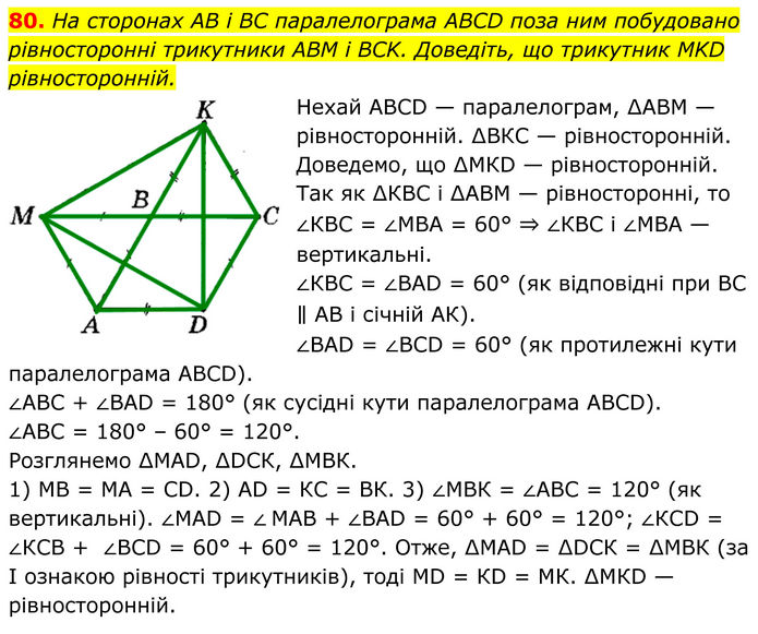 На сторонах AB і BC паралелограма ABCD поза ним побудовано рівносторонні трикутники ABM і BCK. Доведіть, що трикутник MKD рівносторонній. Нехай АВСD — паралелограм, ∆АВМ — рівносторонній. ∆ВКС — рівносторонній. Доведемо, що ∆МКD — рівносторонній. Так як ∆КВС і ∆АВМ — рівносторонні, то ∠КВС = ∠МВА = 60° ⇒ ∠КВС і ∠МВА — вертикальні. ∠КВС = ∠BAD = 60° (як відповідні при ВС ∥ АВ і січній АК). ∠BAD = ∠BCD = 60° (як протилежні кути паралелограма ABCD). ∠АВС + ∠BAD = 180° (як сусідні кути паралелограма ABCD). ∠АВС = 180° – 60° = 120°. Розглянемо ∆МАD, ∆DСК, ∆МВК. 1) МВ = МА = СD. 2) АD = КС = ВК. 3) ∠МВК = ∠АВС = 120° (як вертикальні). ∠МАD = ∠ MAВ + ∠ВАD = 60° + 60° = 120°; ∠КСD = ∠КСВ + ∠ВСD = 60° + 60° = 120°. Отже, ∆МАD = ∆DСК = ∆МВК (за І ознакою рівності трикутників), тоді МD = КD = МК. ∆МКD — рівносторонній.