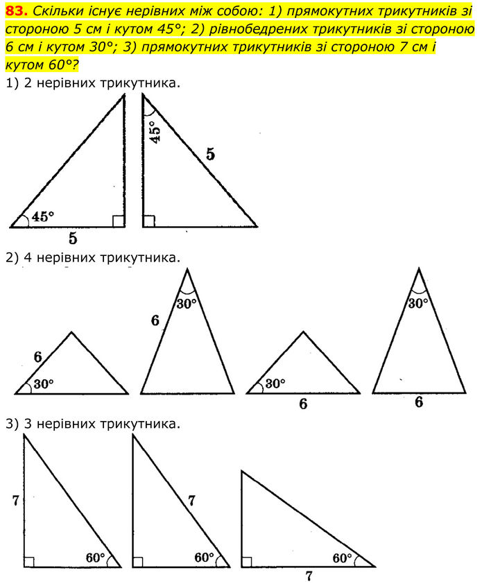 Скільки існує нерівних між собою: 1) прямокутних трикутників зі стороною 5 см і кутом 45°; 2) рівнобедрених трикутників зі стороною 6 см і кутом 30°; 3) прямокутних трикутників зі стороною 7 см і кутом 60°? 1) 2 нерівних трикутника. 2) 4 нерівних трикутника. 3) 3 нерівних трикутника.