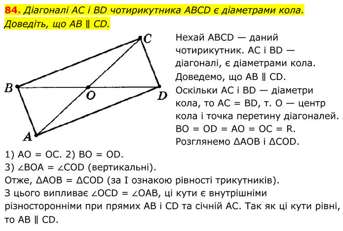 Діагоналі AC і BD чотирикутника ABCD є діаметрами кола. Доведіть, що AB ∥ CD. Нехай АВСD — даний чотирикутник. АС і ВD — діагоналі, є діаметрами кола. Доведемо, що АВ ∥ СD. Оскільки АС і ВD — діаметри кола, то АС = BD, т. О — центр кола і точка перетину діагоналей. ВО = ОD = АО = ОС = R. Розглянемо ∆АОВ і ∆СОD. 1) АО = ОС. 2) ВО = ОD. 3) ∠ВОА = ∠СОD (вертикальні). Отже, ∆АОВ = ∆СОD (за І ознакою рівності трикутників). З цього випливає ∠ОСD = ∠ОАВ, ці кути є внутрішніми різносторонніми при прямих АВ і СD та січній АС. Так як ці кути рівні, то АВ ∥ СD.