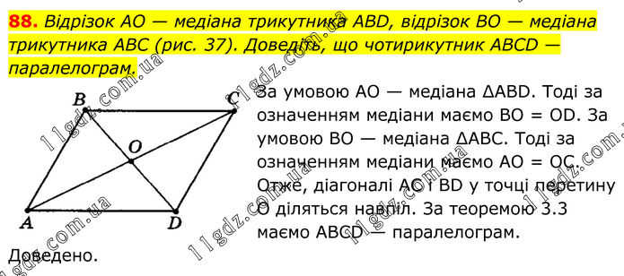 88. Відрізок AO — медіана трикутника ABD, відрізок BO — медіана трикутника ABC (рис. 37). Доведіть, що чотирикутник ABCD — паралелограм. За умовою АО — медіана ∆АВD. Тоді за означенням медіани маємо ВО = ОD. За умовою ВО — медіана ∆АВС. Тоді за означенням медіани маємо АО = ОС. Отже, діагоналі АС і ВD у точці перетину О діляться навпіл. За теоремою 3.3 маємо АВСD — паралелограм. Доведено.