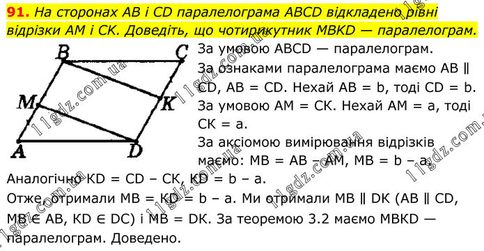 91. На сторонах AB і CD паралелограма ABCD відкладено рівні відрізки AM і CK. Доведіть, що чотирикутник MBKD — паралелограм. За умовою АВСD — паралелограм. За ознаками паралелограма маємо АВ ∥ СD, АВ = СD. Нехай АВ = b, тоді СD = b. За умовою АМ = СК. Нехай АМ = а, тоді СК = а. За аксіомою вимірювання відрізків маємо: МВ = АВ – АМ, МВ = b – а. Аналогічно КD = СD – СК, КD = b – а. Отже, отримали МВ = КD = b – а. Ми отримали МВ ∥ DК (АВ ∥ СD, МВ ∈ АВ, КD ∈ DС) і МВ = DК. За теоремою 3.2 маємо МВКD — паралелограм. Доведено.